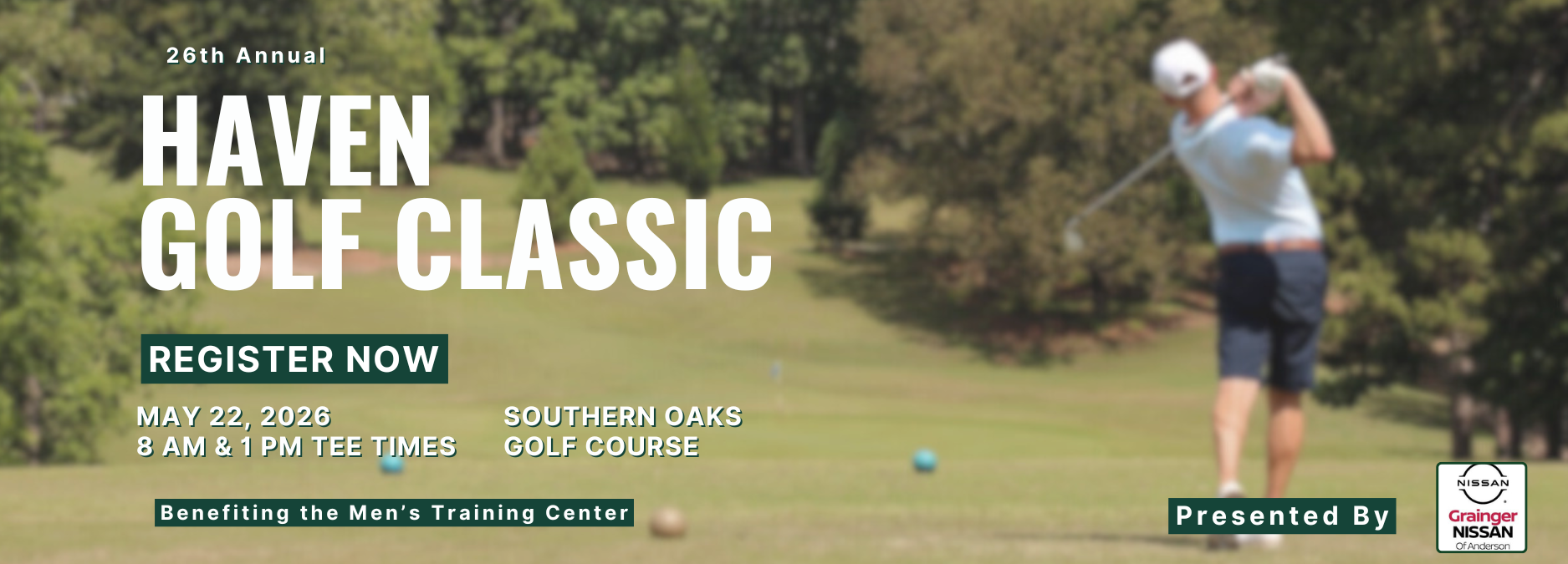 The 26th Annual Haven Golf Classic will be played at Southern Oaks Golf Course in Easley, SC. The event is sponsored by Grainger Nissan of Anderson and will benefit the Men's Training Center. Shotgun start times are 8 AM and 1 PM, and it is a Captain's Choice Tournament.